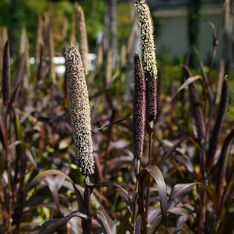 Ornamental Millet is famous for its broad, corn-like leaves that turn a deep, moody purple (nearly black) in full sun. In mid-to-late summer, it produces thick, cylindrical flower spikes covered in golden pollen, which eventually mature into dense seed heads that birds absolutely adore.