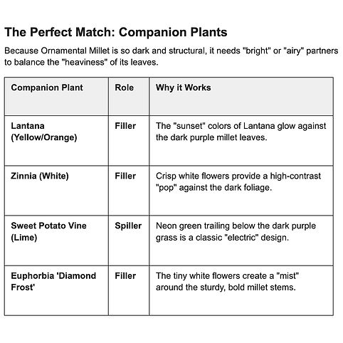 The "Corn-Look" Warning: Don't be alarmed when you first buy your Ornamental Millet at the nursery! Young plants often look like plain green corn stalks. Once you get them home into full sun and the summer heat kicks in, the "magic" happens and the leaves will deepen into that famous royal purple.