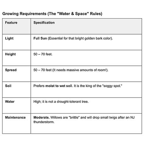 Year-Round Gold: The "Tristis" variety is prized for its golden-yellow twigs. In the winter, when most trees look grey and lifeless, a Weeping Willow glows like a beacon of sunshine against the snow or a leaden NJ sky.